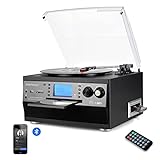- 【9-in-1 Record Player】Nuestro gramófono multifuncional está equipado con tres ajustes de velocidad, conectividad Bluetooth, altavoces estéreo integrados y funcionalidad de radio AM / FM y soporta USB / SD / MMC y reproducción de CD / Cassette.